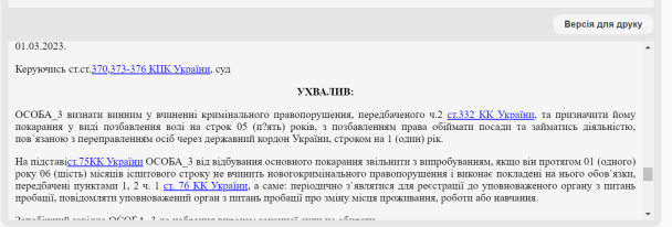 Суд визнав чоловіка винним за ч.2 ст.332 КК України та засудив до 5 років позбавлення волі і заборонив займатись діяльністю, пов’язаною із переправленням за кордон. Проте цей вирок суд замінив на 1 рік та 6 місяців іспитового.