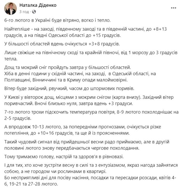 За повідомленням синоптика Наталки Діденко в Україні завтра, 6 лютого, вогко, вітряно, але тепло.