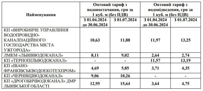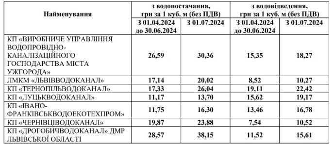 Наприклад, для КП «Виробниче управління водопровідно-каналізаційного господарства міста Ужгород» тариф пропонують підвищити із 1 квітня — до 10,63 гривень за 1 куб. м, а з 1 липня — до 11,88 гривень 1 куб. м, для ЛМКМ «Львівводоканал»: із 1 квітня — до 8,11 гривень 1 куб. м, із 1 липня — 9,02 гривень 1 куб. м.
