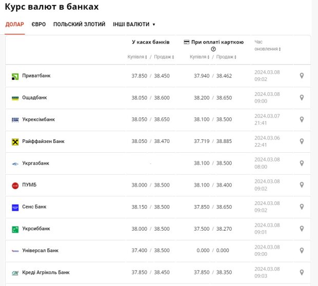 Валютні курси, що встановлені Національним банком України на сьогодні, 9 березня, мають наступні показники: курс долара США зараз дорівнює 38,0836 гривень за 1 долар. Курс євро наразі складає 41,4883 гривень за 1 євро.