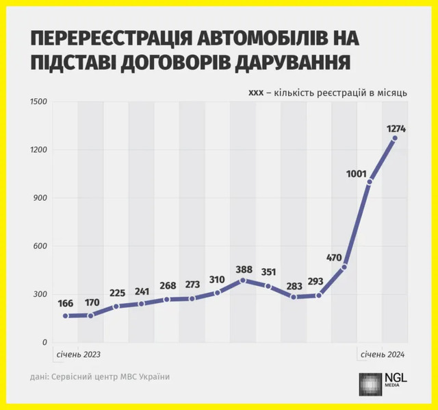 Якщо зазвичай щомісяця таких випадків було близько двохсот, то з літа 2023 року кількість перереєстрацій автомобілів на підставі договорів дарування почала зростати. У грудні кількість таких договорів сягнула майже 500, у січні – перевищила 1000, у лютому – сягнула майже 1300 договорів.
