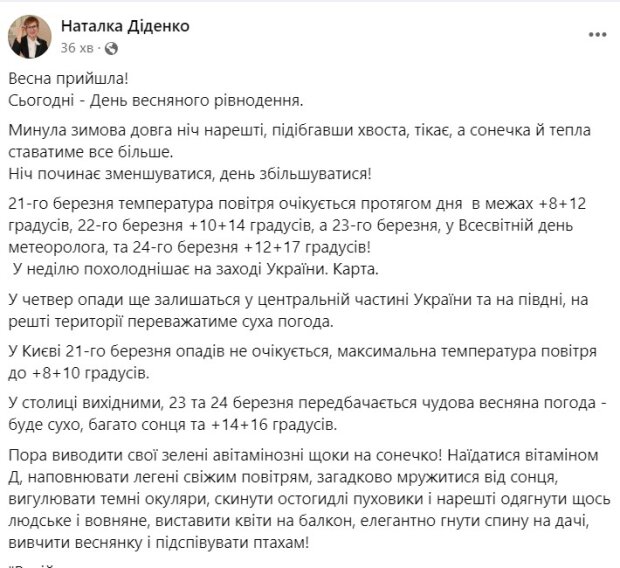 За повідомленням народного синоптика Наталки Діденко в Україні завтра, 21 березня, відчуватиметься весна. Адже, вона прийшла вже і за всіма природніми законами.