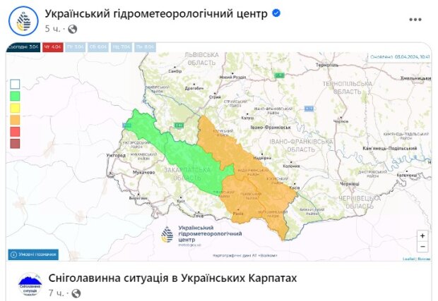 Крім того, значна сніголавинна небезпека спостерігається на високогiр’ї Iвано-Франкiвської та в східній частині Закарпатської областей. Можливе сходження лавин. Прогулянки в горах категорично заборонені.
