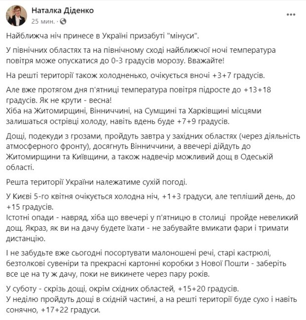 За повідомленням народного синоптика Наталки Діденко в Україні завтра, 5 квітня, в повітрі «морозні показники».