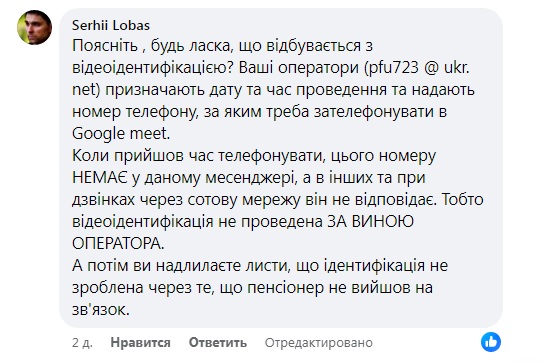 “Поясніть, будь ласка, що відбувається з відеоідентифікацією? Ваші оператори (pfu723 @ ukr. net) призначають дату та час проведення та надають номер телефону, за яким треба зателефонувати в Google meet. Коли прийшов час телефонувати, цього номеру НЕМАЄ у даному месенджері, а в інших та при дзвінках через сотову мережу він не відповідає. Тобто відеоідентифікація не проведена ЗА ВИНОЮ ОПЕРАТОРА. А потім ви надлилаєте листи, що ідентифікація не зроблена через те, що пенсіонер не вийшов на зв’язок”, – пише чоловік.