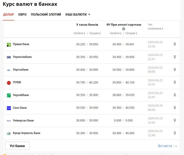 Валютні курси, що встановлені Національним банком України на сьогодні, 23 квітня, мають наступні показники: курс долара США зараз дорівнює 39,586 гривень за 1 долар. Курс євро наразі складає 42,262 гривень за 1 євро.