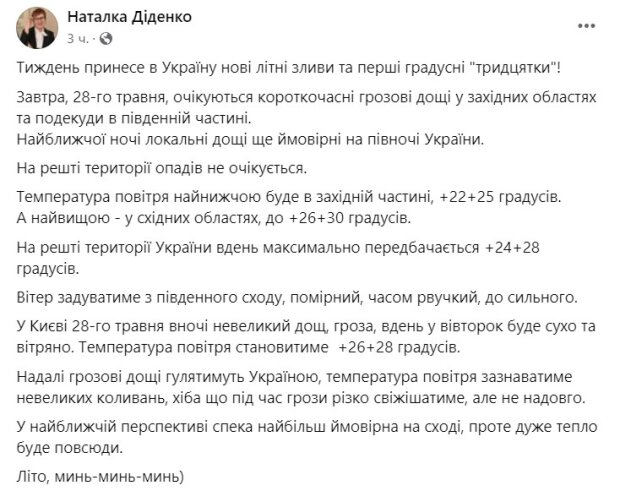 За повідомленням синоптика Наталки Діденко в Україні завтра, 28 травня, пройдуть грозові зливи, і в повітрі жаритиме аж до +30.