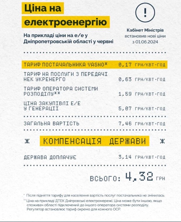 “Сьогодні Кабінет Міністрів встановив нову ціну на електроенергію — 4,32 грн/кВт∙год.