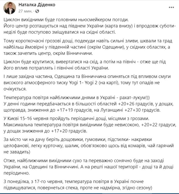 За повідомленням синоптика Наталки Діденко в Україні завтра, 15 червня, грозові дощі, місцями навіть дуже сильні зливи, шквали та град. Вони найбільш ймовірні у південній частині (окрім Одещини), у східних областях, а також зачепить центр, окрім Вінниччини.