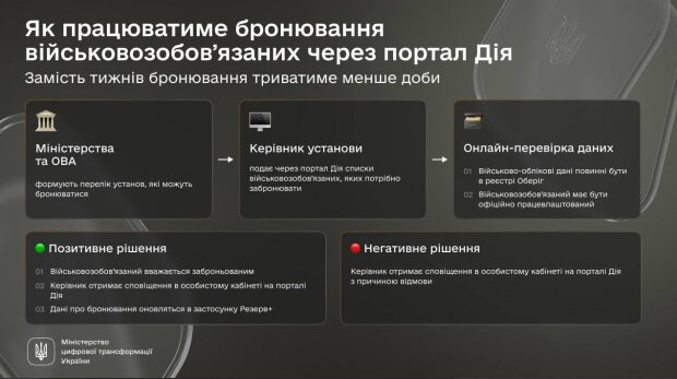 Варто зазначити, що у разі позитивної відповіді про бронювання працівника відповідні дані підтягнуться до “Резерву+”, а керівник підприємства отримає відповідне повідомлення в особистому кабінеті на порталі “Дія”.