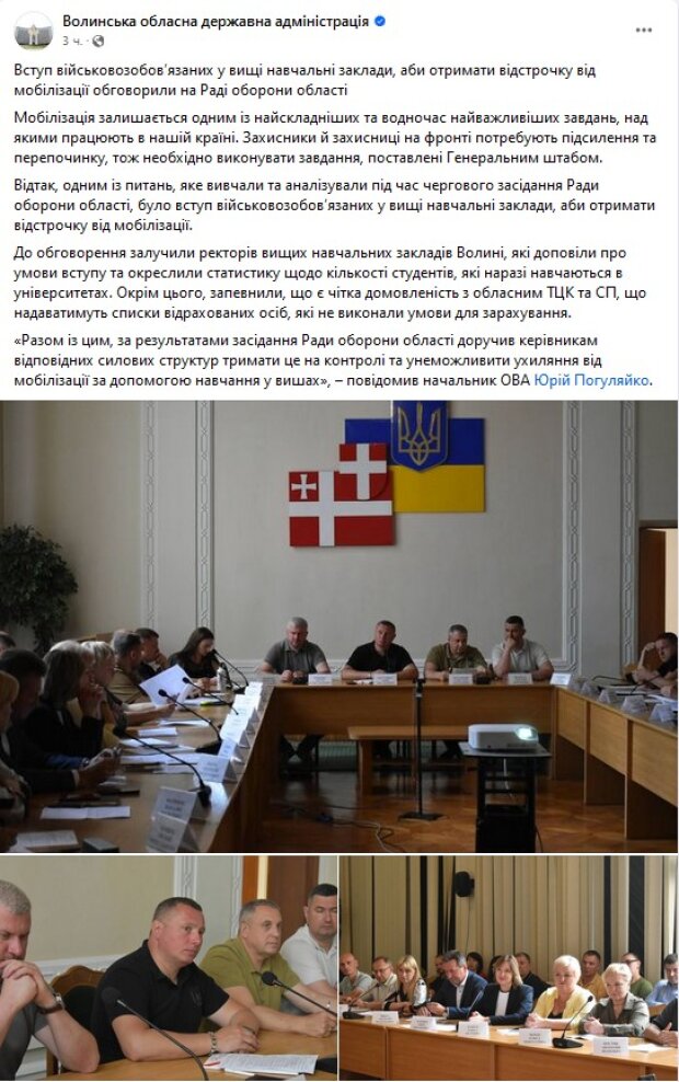 У Волинській обласній державній адміністрації обговорювалося питання про вступ військовозобов’язаних українців до вищих навчальних закладів з метою отримання відстрочки від мобілізації, оскільки багато чоловіків вирішили скористатися лазівкою та не потрапити на військову службу.