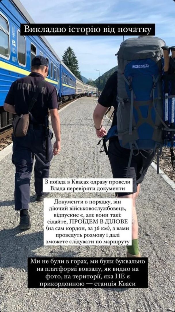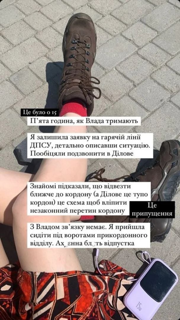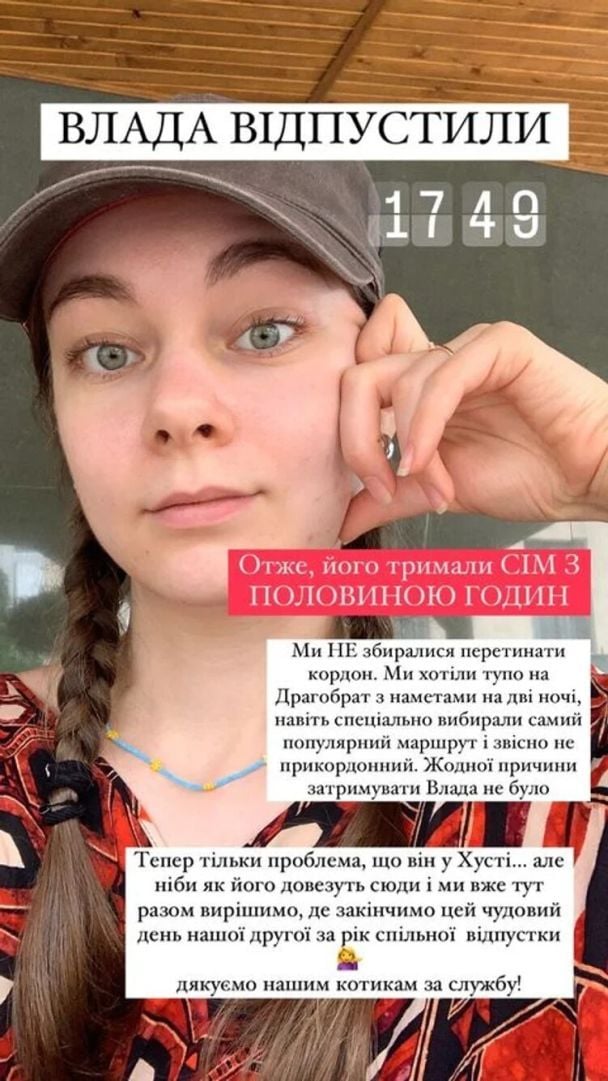 За словами дівчини, вранці у селі Кваси Закарпатської області її чоловіка Влада зупинили правоохоронці та прикордонники, щоб перевірити документи. Військовий показав УБД й дозвіл на відпустку. Пара назвала мету і маршрут свого походу. Журналістка наголошує, що у прикордонній зоні вони не перебували.