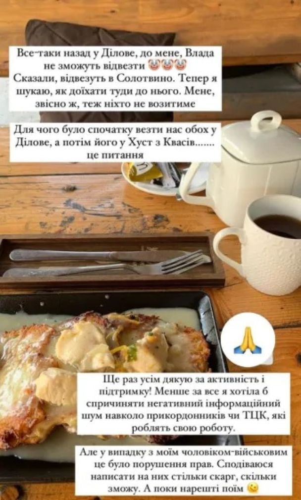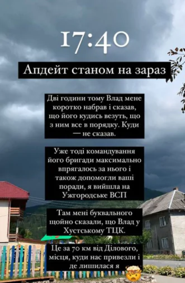 Згодом чоловік зателефонував й розповів, що його “кудись везуть”. Журналістка звернулася до ужгородської Військової служби правопорядку і командування бригади, у якій служить її чоловік. За їхною допомогою, їй вдалося дізнатися, що Владислава повезли до Хустського ТЦК, за 70 кілометрів від Ділового, куди подружжя привезли з Квасів.