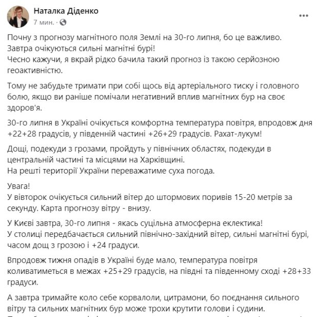 За повідомленням синоптика Наталки Діденко в Україні завтра, 30 липня, сильні магнітні бурі та комфортна температура повітря. Якщо з першим треба бути досить обережними, то другим показником можна просто насолоджуватися.