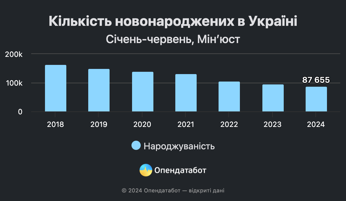За даними Міністерства юстиції, за перше півріччя 2024 року в Україні народилось 87 655 дітей — це на 9% менше, аніж за аналогічний період торік. Водночас зафіксовано 250 972 смертей. Найбільше немовлят та померлих в Україні було на Дніпропетровщині та в Києві.