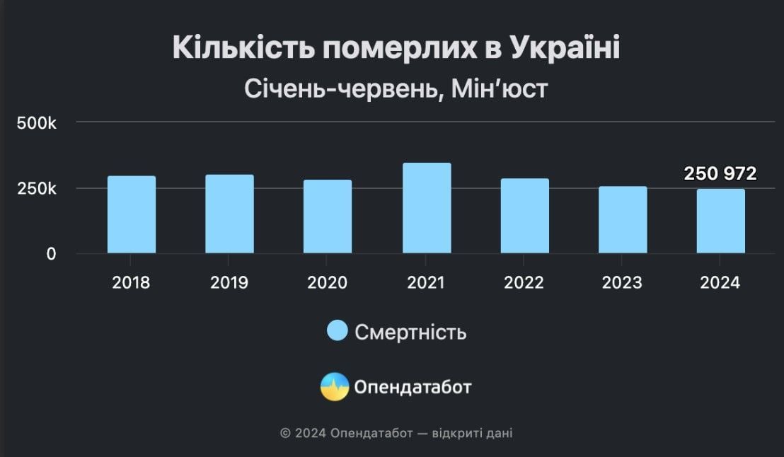 250 972 людини померли в Україні за перші пів року 2024-го. Це у 1,4 раза менше, ніж за аналогічний період 2021 року, коли зафіксували 349 041 померлого. Проте, варто зазначити, що 2021-й був піковим на смерті через пандемію COVID-19.
