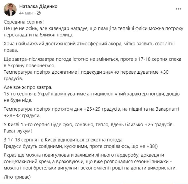 За повідомленням синоптика Наталки Діденко в Україні завтра, 15 серпня, середина серпня. І хоч температура повітря стрімко піднімається вверх, серпень вже натякає на теплі речі та вказує на їх ближнє розміщення на полицях у шафі. Хоча найближчий двотижневий атмосферний акорд чітко заявить свої літні права.