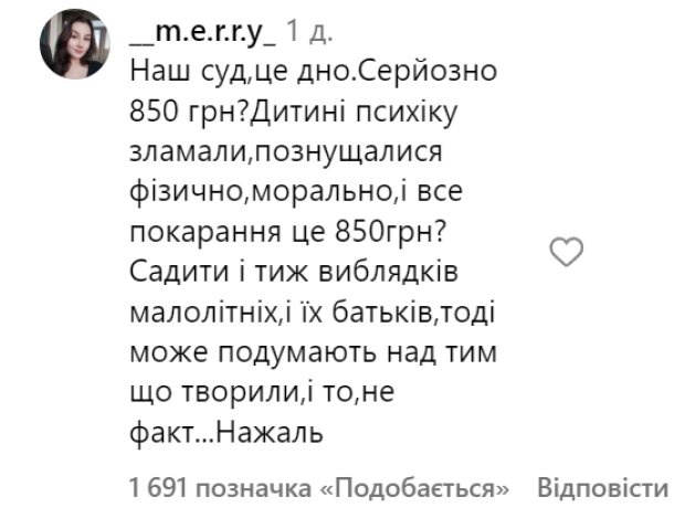 Оскільки зловмисники не досягли 16 років, їхні батьки отримали штрафи: 850 та 1190 гривень за погане виховання дітей. Інформації про третього хлопця, який, можливо, теж брав участь, поки що немає, оскільки він уже досяг 18 років.