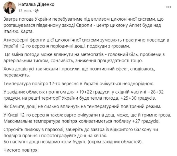 За повідомленням синоптика Наталки Діденко в Україні завтра, 12 вересня, дощі, грози та контрасти в температурі повітря.
