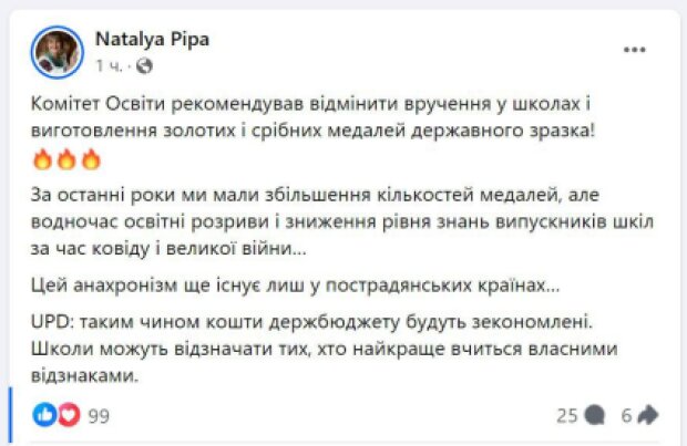 Докладніше про те, що в Україні планують скасувати вручення у школах, а також виготовлення золотих та срібних медалей державного зразка, інформує народний депутат України, секретар комітету Верховної Ради з питань освіти, науки та інновацій Наталія Піпа у соціальних мережах.