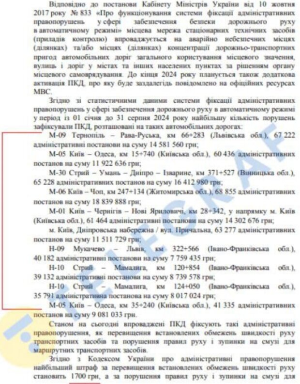 Найприбутковіша камера автофіксації порушень розташована на трасі М-06 «Київ – Чоп» біля села Дідовичі (Житомирська обл.). Всього за 8 місяців вона зібрала 18,8 млн грн штрафів.