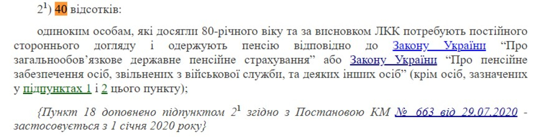 У постанові, у якій ідеться про надбавки для людей віком понад 80 років, вказуються інші категорії громадян, які можуть отримувати додаткові виплати на догляд. Серед них — особи з інвалідністю І групи внаслідок війни та деякі категорії отримувачів пенсії за вислугу років. Розмір доплат — від 15 до 100% залежно від норм, перелічених у п. 18 постанови Кабміну.