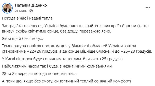 За повідомленням синоптика Наталки Діденко в Україні завтра, 24 вересня, тепла погода. Саме так, у вівторок, наша країна займе почесне ім’я – найтепліша країна Європи. Скрізь сонячно, без дощу. Можливе де місцями пробіжить пухната хмарина, але вона додасть тільки пейзажності осінньому небу.