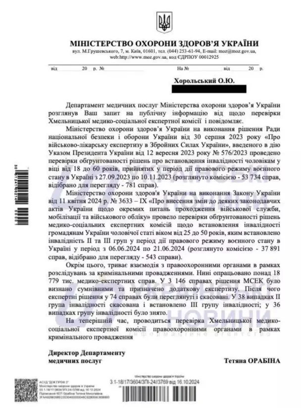 На теперішній час, проводиться перевірка Хмельницької медикосоціальної експертної комісії правоохоронними органами в рамках кримінального провадження.
