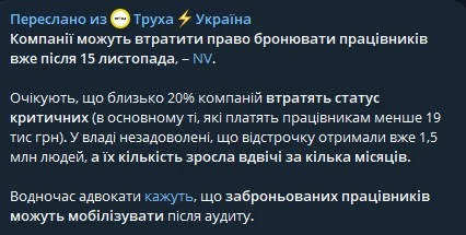 Скасування права бронювання співробітників може торкнутися великої кількості підприємств. Очікується, що після 15 листопада близько 20% компаній, які раніше мали статус критично важливих, можуть втратити його. Причому особливо це стосується організацій, де заробітні плати нижчі за 19 тисяч гривень.