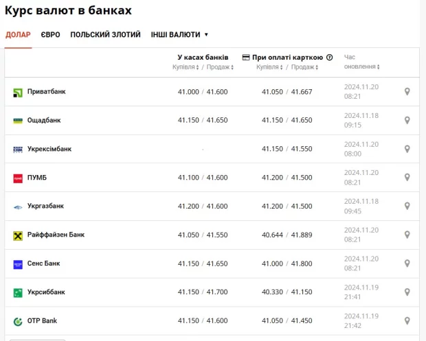 Валютні курси, що встановлені Національним банком України на сьогодні, 20 листопада, мають наступні показники: курс долара США зараз дорівнює 41,331 гривень за 1 долар. Курс євро наразі складає 43,691 гривень за 1 євро.