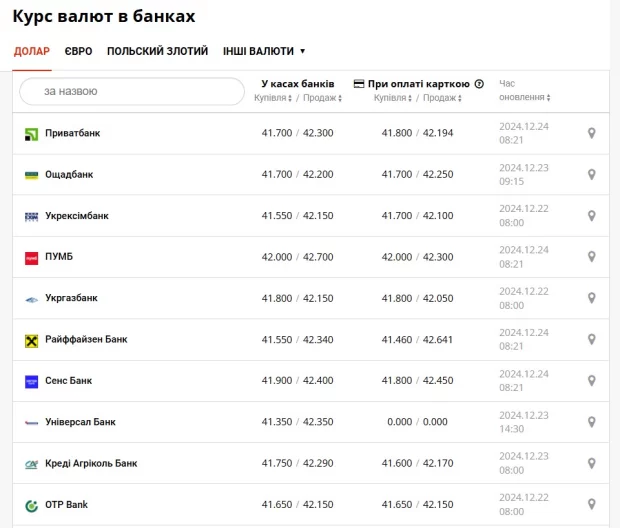 Валютні курси, що встановлені Національним банком України на сьогодні, 24 грудня, мають наступні показники: курс долара США зараз дорівнює 41,991 гривень за 1 долар. Курс євро наразі складає 43,6454 гривень за 1 євро.