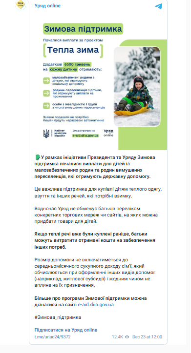 “Це важлива підтримка для купівлі дітям теплого одягу, взуття та інших речей, які потрібні взимку. Водночас Уряд не обмежує батьків переліком конкретних торгових мереж чи сайтів, на яких можна придбати товари для дітей”, – йдеться у публікації.