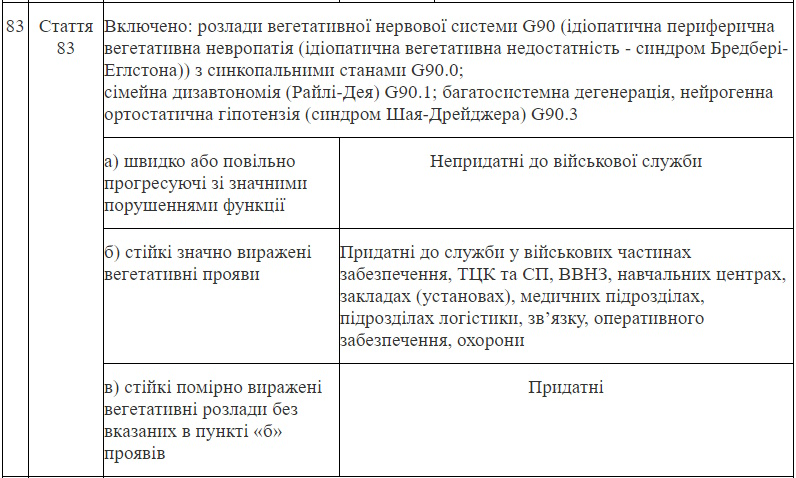 Вони прописані у розділі XVIII Розкладу хвороб Наказу №402 Міністерства оборони України, а точніше – у статтях 82-87. Йдеться про такі захворювання, як незбалансоване харчування, недостатній фізичний розвиток людини, заїкання, розлади вегетативної нервової системи тощо.