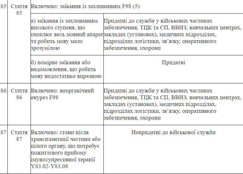 придатними до служби у ТЦК, навчальних центрах та військових навчальних закладах, медичних підрозділах, частинах забезпечення, логістики, зв’язку та охорони, якщо у них спостерігається заїкання високого ступеня, що робить мову людини мало зрозумілою; повністю придатними до служби, якщо у них виявлено помірне заїкання.