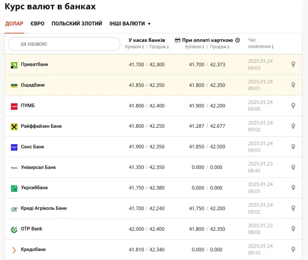 Національний банк України встановив офіційний курс валют на п’ятницю, 24 січня. Так, порівняно з попереднім днем, вартість долара США впала на 6 копійок і становить 41,97 гривні.