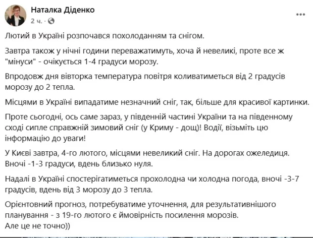 За повідомленням синоптика Наталки Діденко в Україні завтра, 4 лютого, тенденція похолодання продовжиться. Саме так, лютий розпочався зниженням градусів та снігом. У нічні години очікуємо -1 – -4 градуси морозу. Впродовж дня теж прохолодно: стовпчики термометрів покажуть -2 – +2 градуси тепла.