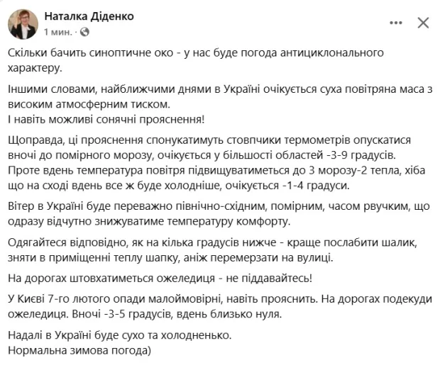 За повідомленням синоптика Наталки Діденко в Україні завтра, 7 лютого, властвуватиме суха повітряна маса з високим атмосферним тиском. А це означає, що опадів не прогнозується. І навіть можливі прояснення.