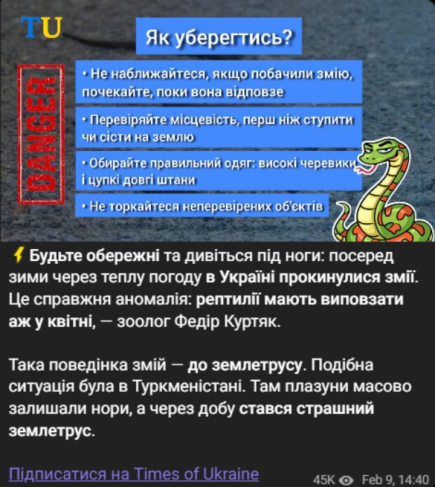 Мешканці України стали свідками тривожної природної аномалії — змії почали прокидатися на кілька місяців раніше терміну через надзвичайно теплу погоду у лютому цієї зими.