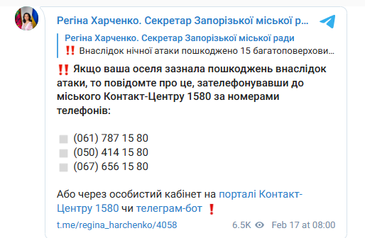Якщо оселя українців зазнала пошкоджень внаслідок атаки, то про це необхідно повідомити, зателефонувавши до міського Контакт-Центру 1580. Це дозволить отримати фінансову допомогу у розмірі 15 тис. грн, розповіла секретар Запорізької міськради Регіна Харченко.