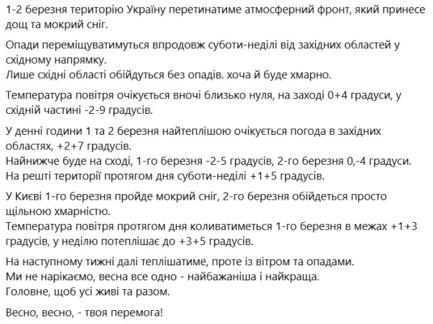 За повідомленням синоптика Наталки Діденко в Україні завтра, 1 березня, атмосферний фронт принесе дощ та мокрий сніг. Опади переміщуватимуться впродовж дня від західних до східних областей. Хоча сам схід залишиться без опадів, у суботу на нього чекає суха погода.
