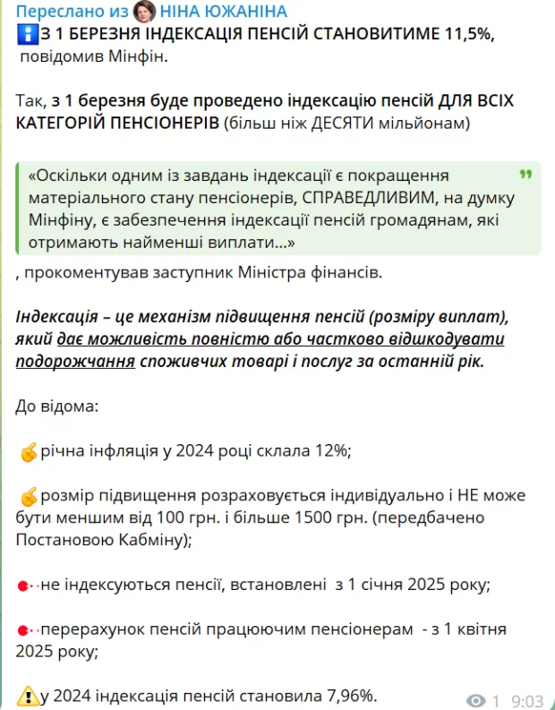 “Так, з 1 березня буде проведено індексацію пенсій ДЛЯ ВСІХ КАТЕГОРІЙ ПЕНСІОНЕРІВ (більш ніж ДЕСЯТИ мільйонам)”, – зазначила Южаніна.