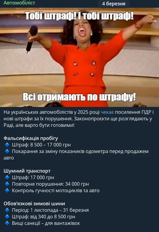 • Штраф за відсутність зимової гуми становитиме від 340 до 8 500 гривень, причому максимально допустимі штрафні санкції будуть застосовуватись до вантажних автомобілів.