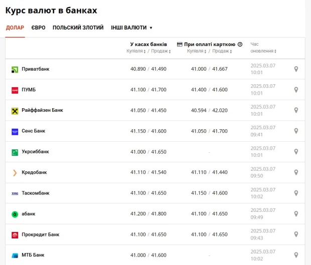 Валютні курси, що встановлені Національним банком України на сьогодні, 7 березня, мають наступні показники: курс долара США зараз дорівнює 41,2742 гривень за 1 долар. Курс євро наразі складає 44,5596 гривень за 1 євро.